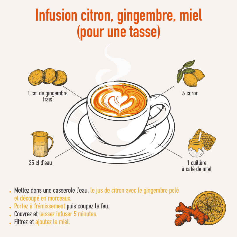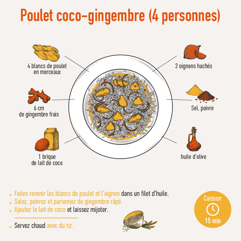 Le gingembre se consomme sous toutes ses formes : frais, confit ou en poudre. Il s’utilise partout, dans les plats comme dans les desserts, les boissons chaudes ou froides. Mieux vaut toutefois l’intégrer par petites quantités, toujours dans le cadre d’une alimentation équilibrée, afin d’éviter les brûlures d’estomac. Astuce : une fine lamelle dans un smoothie pomme-banane vous permettra de vous familiariser avec son goût puissant.