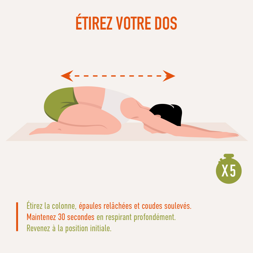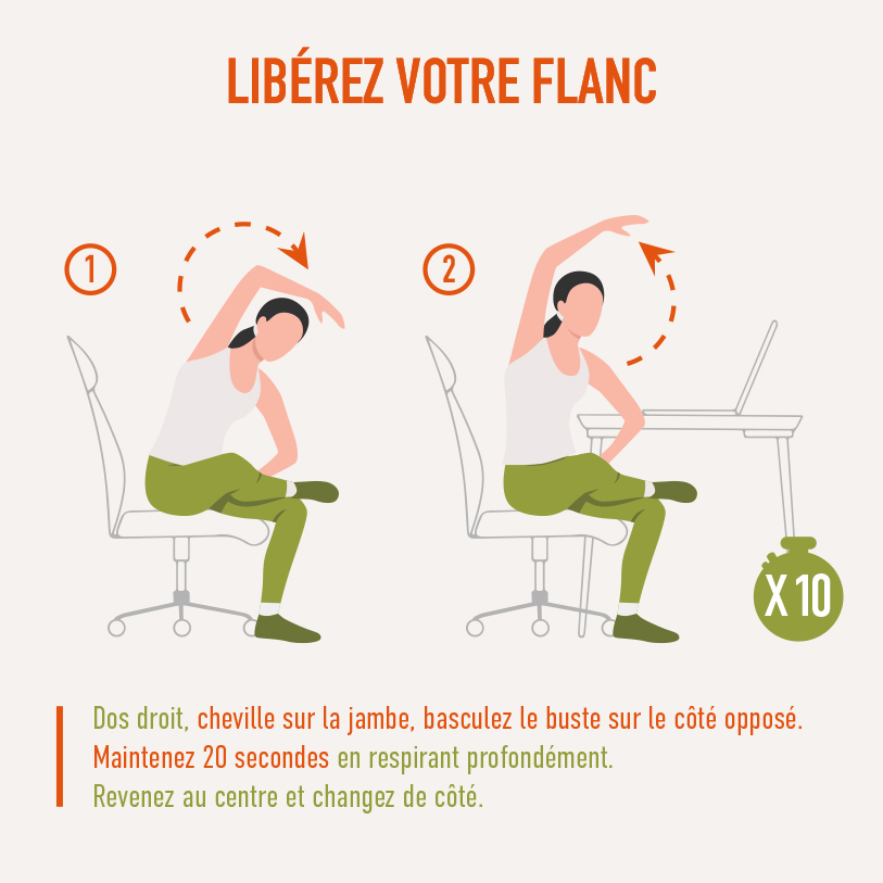Pour adopter une bonne posture, il faut répartir équitablement votre poids sur vos deux pieds. Quand vous vous baissez, gardez votre dos droit et pliez les genoux. Assis, chez vous ou en voiture, le bas du dos doit être maintenu contre votre siège. Pensez donc à bien le régler. Idem au bureau : veillez à garder les pieds à plat sur le sol (sans croiser les jambes), les avant-bras posés sur la table et le regard aligné avec le haut de l’écran. Enfin, levez-vous fréquemment pour changer de position, marcher ou réaliser des étirements afin de remettre votre corps en place.